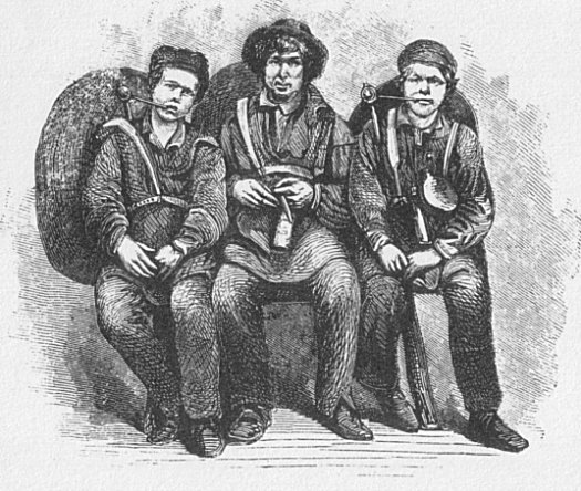 Their aspect when accoutered for work is given in the frontispiece. If compared with their mediæval appearance, as displayed in the miners’ crest, p. 68the interval of four hundred years is scarcely discoverable. Every mining appurtenance is retained, only somewhat altered in shape, and that, perhaps, not for the better, be it cap, “bellis,” or general attire. Only the beard is absent, but then there are the shoes.