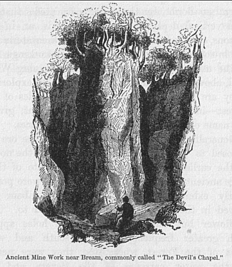 They have the appearance either of spacious caves, as above Lydney and on the Doward Hill, or of deep p. 3stone quarries, as at the Scowles, near Bream. Or they consist of precipitous and irregularly shaped passages, left by the removal of the ore or mineral earth wherever it was found, and which was followed down, in some instances, for many hundreds of yards.