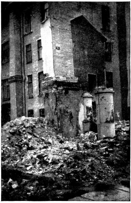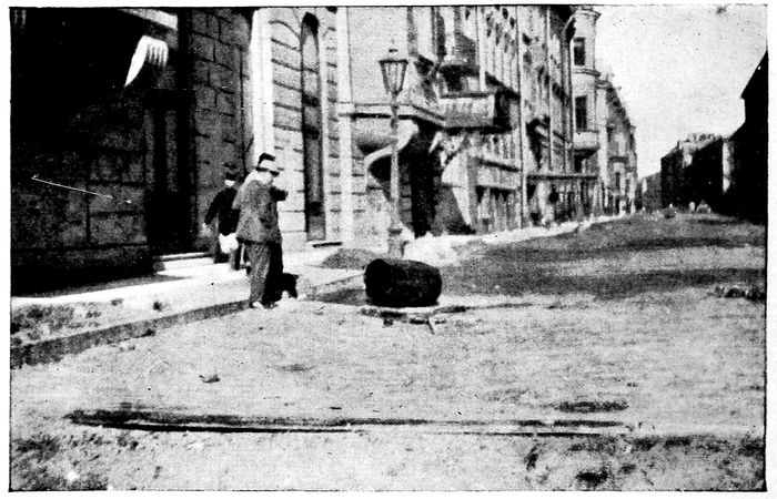 The roads along which these tramcars run are in a frightful condition. They have not been repaired for three or four years; they 22are full of holes like shell-holes, often two or three feet deep. Frost has eaten out great cavities, drains have collapsed, and people have torn up the wood pavement for fires. Only once did we see any attempt to repair the streets in Petrograd. In a side street some mysterious agency had collected a load of wood blocks and two barrels of tar. Most of our longer journeys about the town were done in official motor-cars—left over from the former times. A drive is an affair of tremendous swerves and concussions. These surviving motor-cars are running now on kerosene. They disengage clouds of pale blue smoke, and start up with a noise like a machine-gun battle. Every wooden house was demolished for firing last winter, and such masonry as there was in those houses remains in ruinous gaps, between the houses of stone.