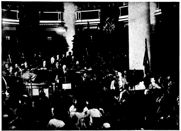 On this second visit we were no longer stranger onlookers, but active participants in the meeting; we came into the body of the hall behind the president’s bench, where on a sort of stage the members of the Government, official visitors, and so forth find accommodation. The presidential bench, the rostrum, and the reporters 137remained, but instead of an atmosphere of weary parliamentarianism, we found ourselves in the crowding, the noise, and the peculiar thrill of a mass meeting. There were, I should think, some two hundred people or more packed upon the semicircular benches round about us on the platform behind the president, comrades in naval uniforms and in middle-class and working-class costume, numerous intelligent-looking women, one or two Asiatics and a few unclassifiable visitors, and the body of the hall beyond the presidential bench was densely packed with people who filled not only the seats but the gangways and the spaces under the galleries. There may have been two or three thousand people down there, men and women. They were all members of the Petersburg Soviet, which is really a sort of conjoint meeting of its constituent soviets. The visitors’ galleries above were equally full.