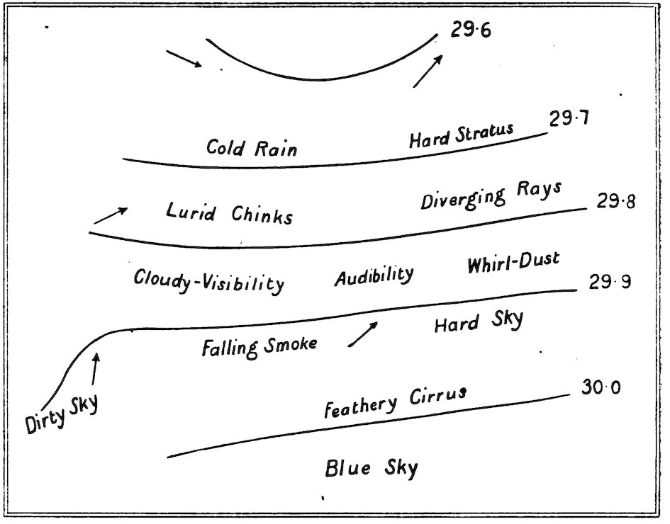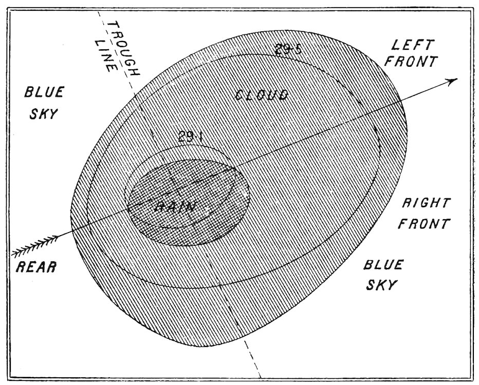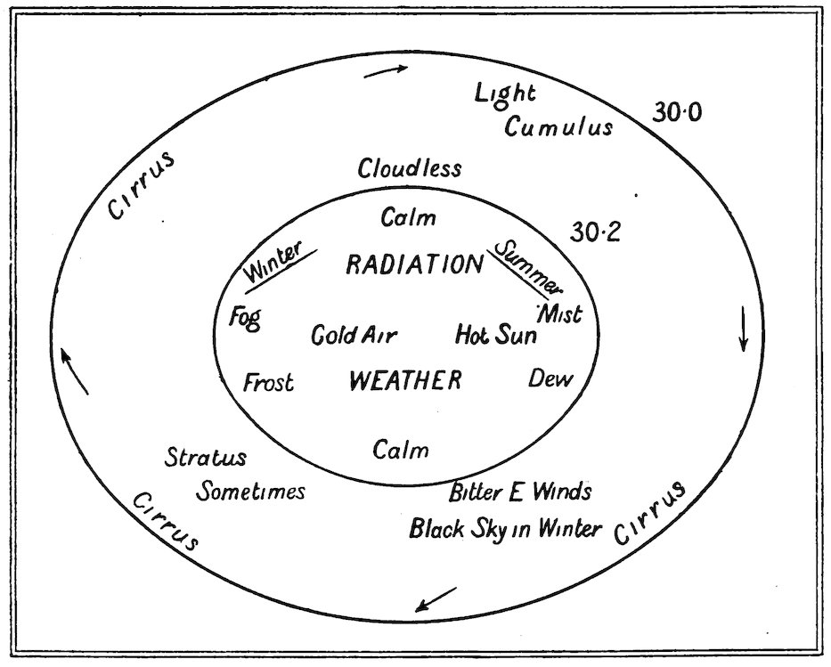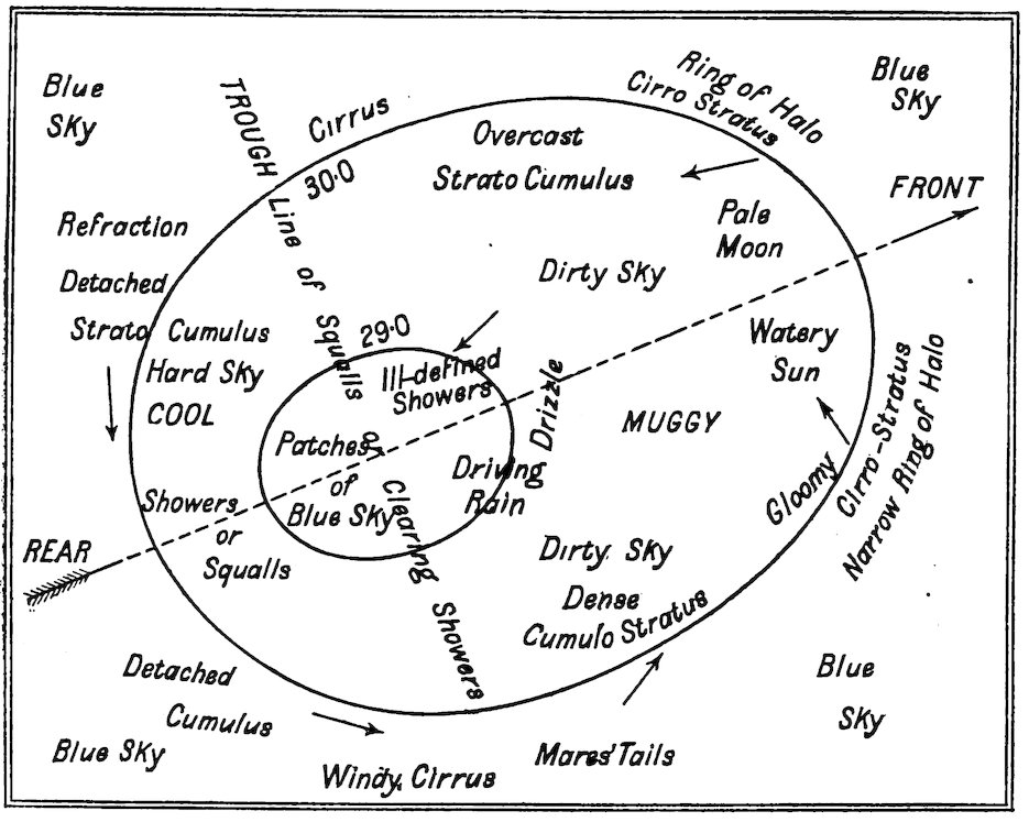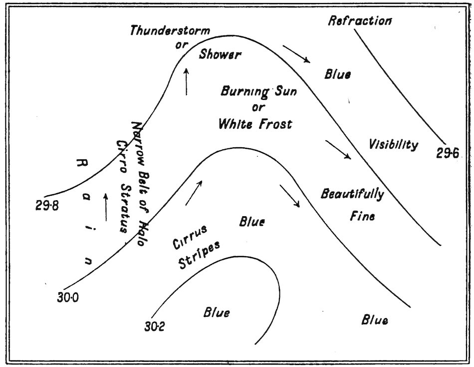 Now, with regard to the prognostics with reference to Fig. 2, where 12the characteristic weather in the different portions of a depression are given in a diagrammatic form, it will be seen that the first indication of a coming change is the appearance of a halo round the sun or moon in the cirro-stratus clouds. Hence,