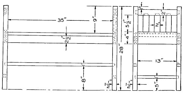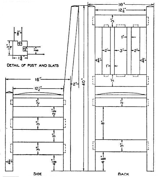 Before putting the chair together, the cleats for holding the seat should be fastened to the sides, back and brace. Use flat-head screws for this purpose. Then put the sides and stretcher together, and fasten the back to the sides with flat-head screws.