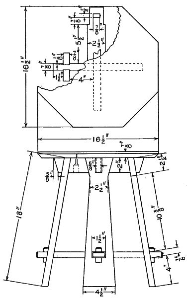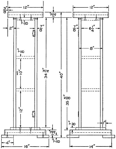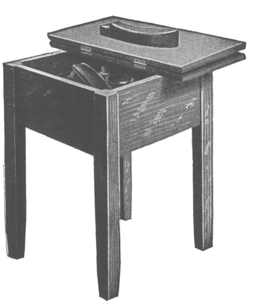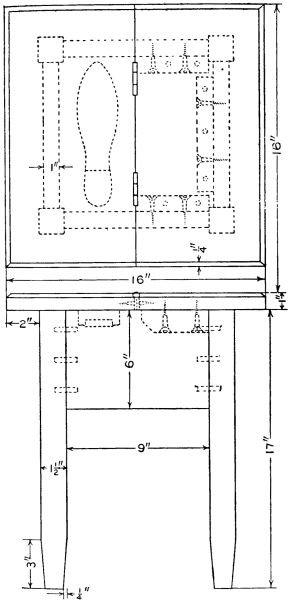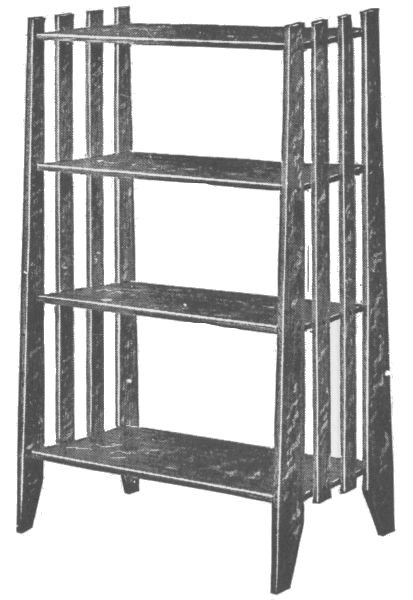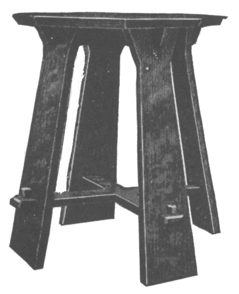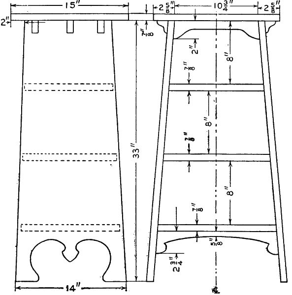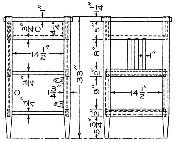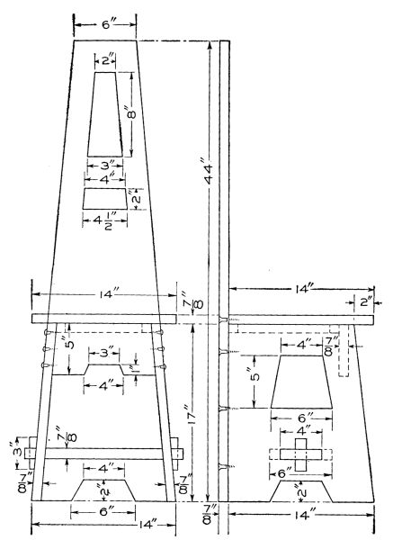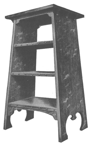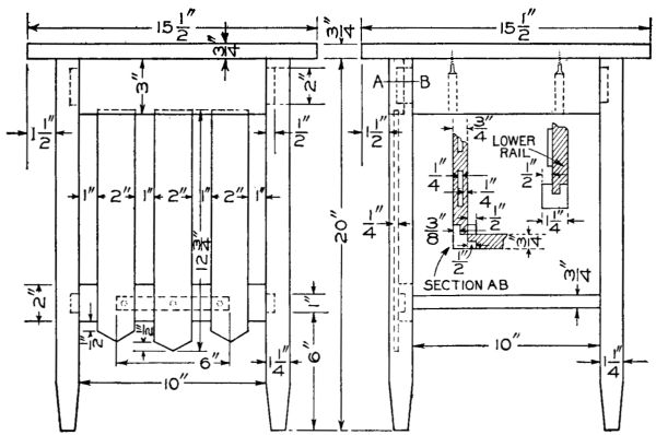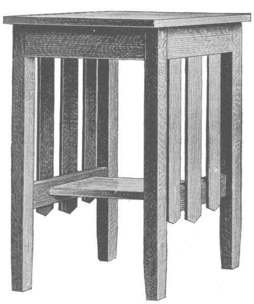 Start work on the four posts by rounding the top corners and shaping the feet as shown. The four posts are identical and the mortises should be laid out on all four at once so as to get them all alike. These should be carefully cut with a sharp chisel. On the inner surface of each leg cut a groove to [113] hold the side boards of the lower compartment. Next prepare the two wide and the four narrow crosspieces, tenoning them to fit the mortises already cut in the legs. The lower crosspieces should also have grooves cut in them to hold the side boards of the compartment. The two complete sides can now be glued and clamped together and set away to dry. While they are drying the remaining parts of the stand can be made. The three horizontal boards are now made by notching out the corners to fit around the legs. They are supported by fastening small cleats to the inner surface of each crosspiece.