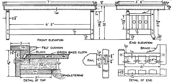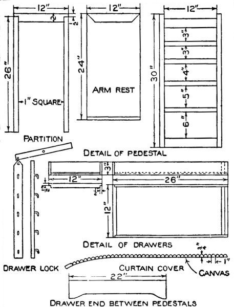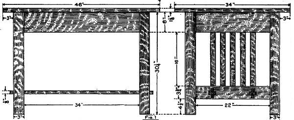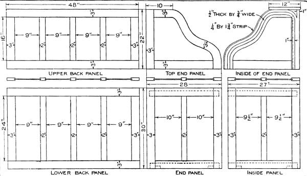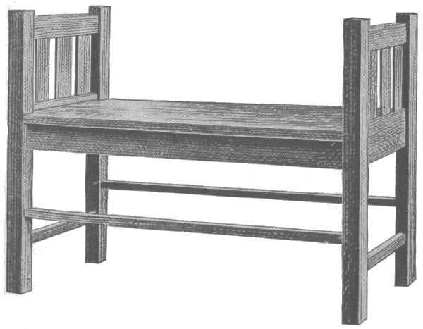 A simple design for a hall or window seat is shown in the accompanying sketch and detail drawing. Anyone who has a few sharp tools, and is at all handy with them, can make this useful and attractive piece of furniture in a few spare hours. [108] Quarter-sawed oak is the best wood to use in its construction, as it looks best when finished and is easy to procure. If the stock is ordered from the mill ready cut to length, squared and sanded, much of the labor will be saved. The following is a list of the material needed: