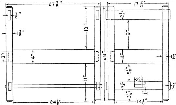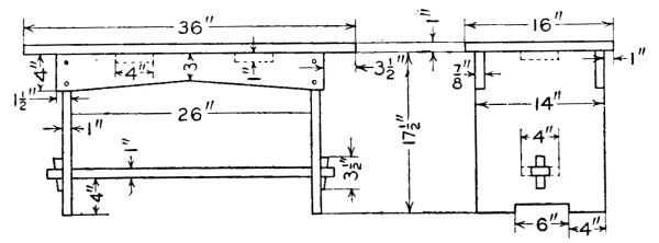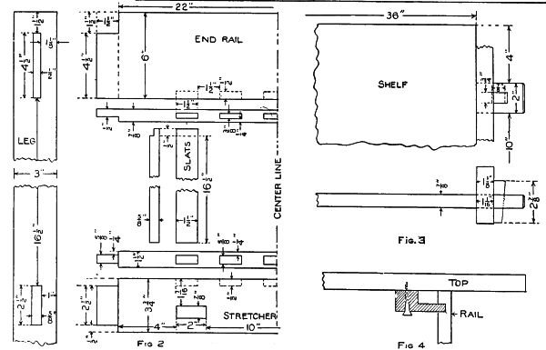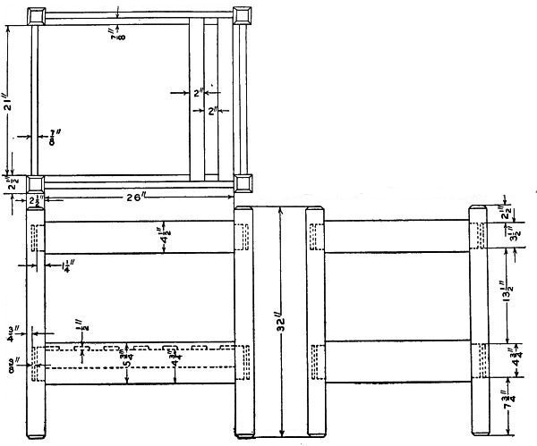 Test all surfaces of the posts with a try-square to see that they are square with each other. Lay out the tenons on the ends of the rails as shown in the sketch and cut with a tenon saw and chisel. Arrange[110] the posts and rails as they are to stand and number each tenon and mortise. Lay out the mortises in the legs, taking the measurements directly from the tenon which is to fit that mortise. Cut the mortises, first having bored to the depth with a 1/4-in. bit.