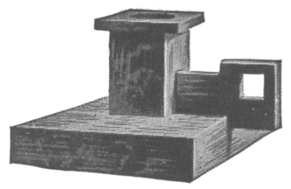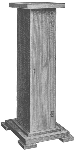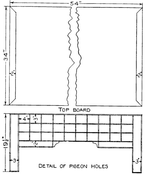 Detail of the Medicine StandThe two ends can now be set up and connected. Notch out the corners of the top board and fit it in place. The top is fastened down by means of screws set in at an angle from below. The back boards can be of soft wood and are fastened in place in the [115] usual manner. The door should be of one piece if possible and should have suitable hinges and a catch.