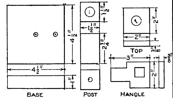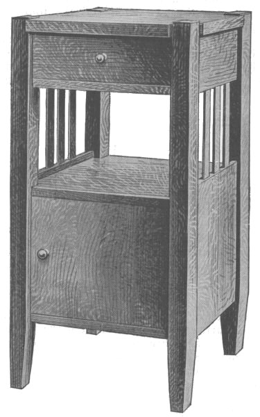 The accompanying sketch and detail drawing show a design of a bedside stand. This is a very desirable piece of furniture and is simple and easy to make. Quarter-sawed oak is the best wood to use in its construction. The material should be ordered from the mill ready cut to length, squared and sanded. The following list of material will be required: