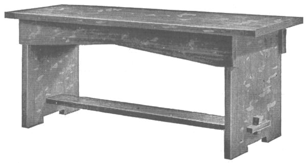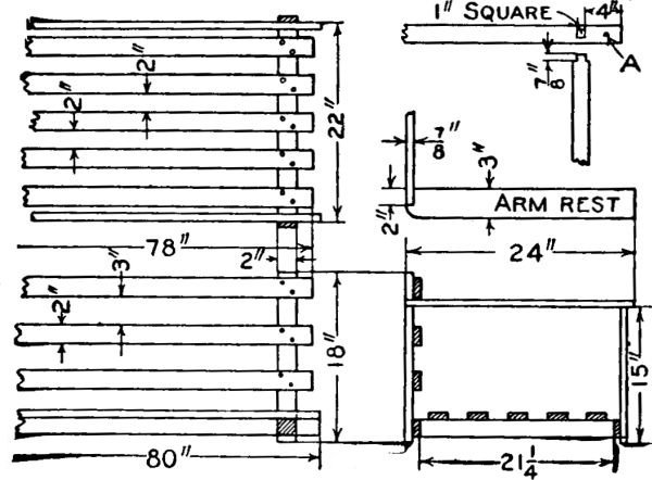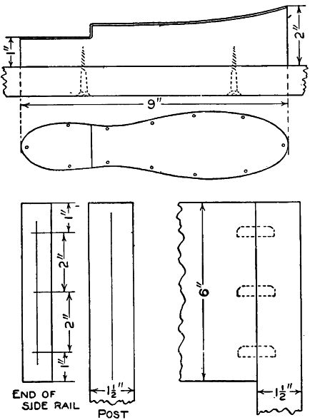 The seat should be made of one piece if possible, otherwise two or more boards will have to be glued together. The corners should be cut out to fit around the posts. It rests on the side rails and cleats fastened to the inner side of the end rails.
