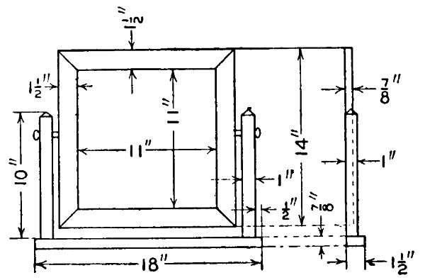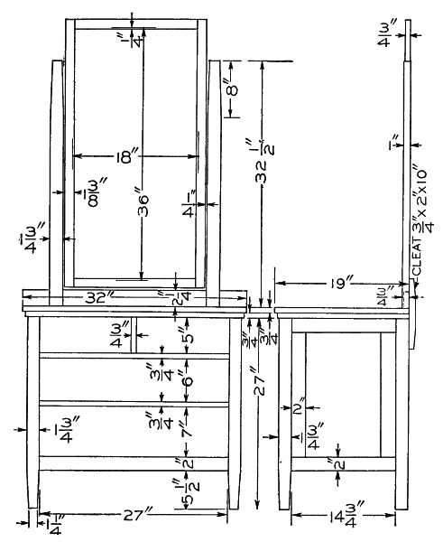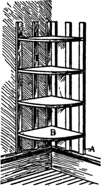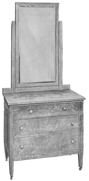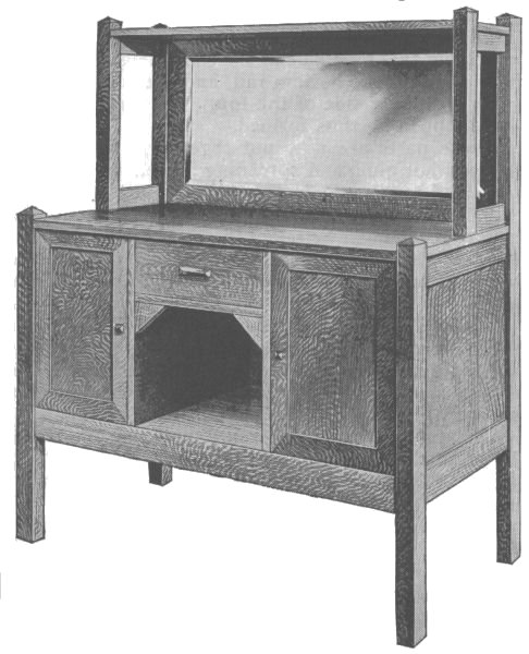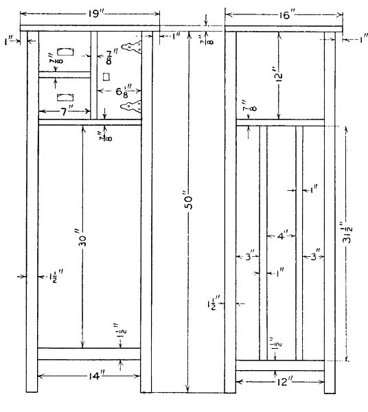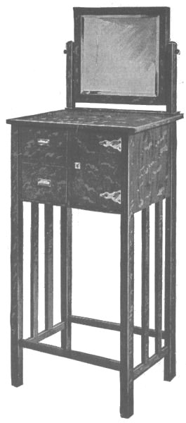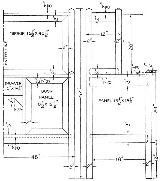 The standards and shelves are put on as shown in the drawing. The mirror is put in a frame, which is made to fit the back opening and has the corners mitered and the back rabbeted to receive the mirror.