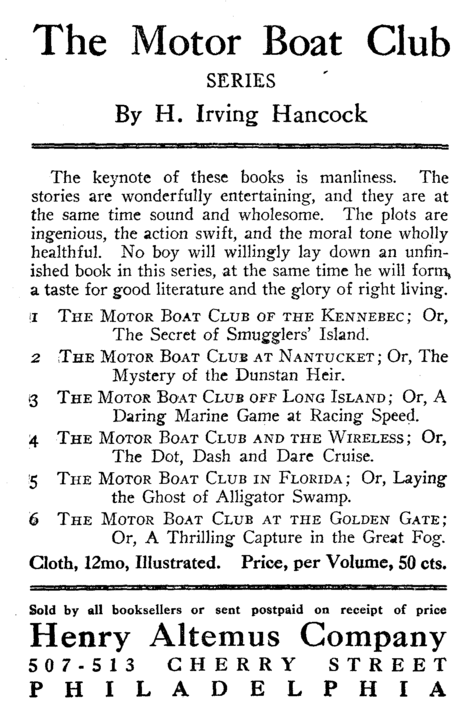 Then came a new cruise, a new set of adventures in new surroundings. It was a cruise which the many friends of our Motor Boat Club boys will agree was the most wonderful, the most 256 exciting, and certainly the most mysterious lot of adventures through which any member of the Club ever passed. The details of what happened, however, must be reserved for the next volume in this series, which will be published under the title: “The Motor Boat Club in Florida; Or, Laying the Ghost of Alligator Swamp.”