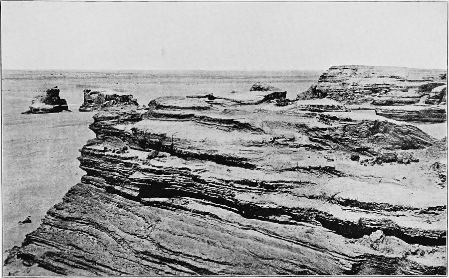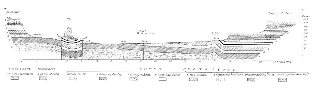 [3]Since writing the above, I have read with much interest a paper on the South-West Desert of Egypt, in which my friend and former colleague, Dr. W. F. Hume, in a discussion of the formation of the oases-depressions, refers to the importance of soft and hard strata, and to the action of folding in exposing the former to the agents of denudation. This is striking confirmation of the views promulgated by me since my first acquaintance with the oases many years ago. Of great interest and value, being new, is the suggestion that the topography of the southern oases and surrounding desert may be, to a considerable extent, due to denudation acting on the country as it was in process of being elevated from the sea in which the deposits forming it had been laid down.