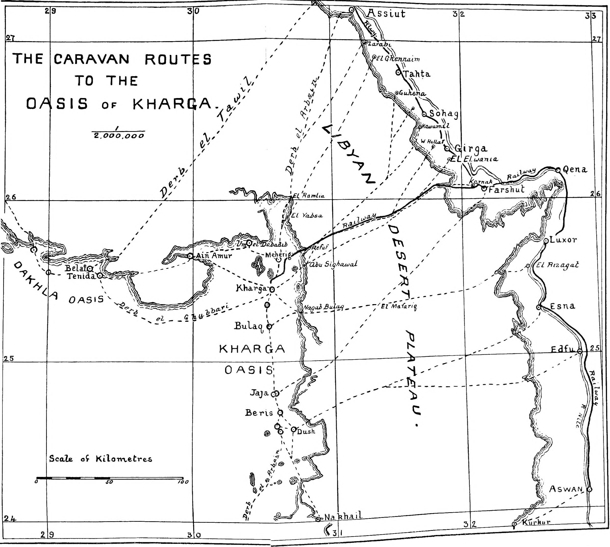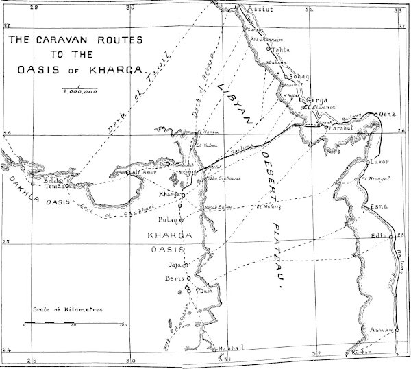 The inhabited depressions of the Libyan Desert, called by Herodotus the ‘Islands of the Blest,’ are interesting alike to the archæologist, to the geographer and geologist, and to the tourist who wishes to wander from the well-beaten tracks, and perhaps none more so than the Oasis of Kharga, lying 130 miles west of Luxor—the site of ancient Thebes—and recently connected by railway with the Nile Valley.