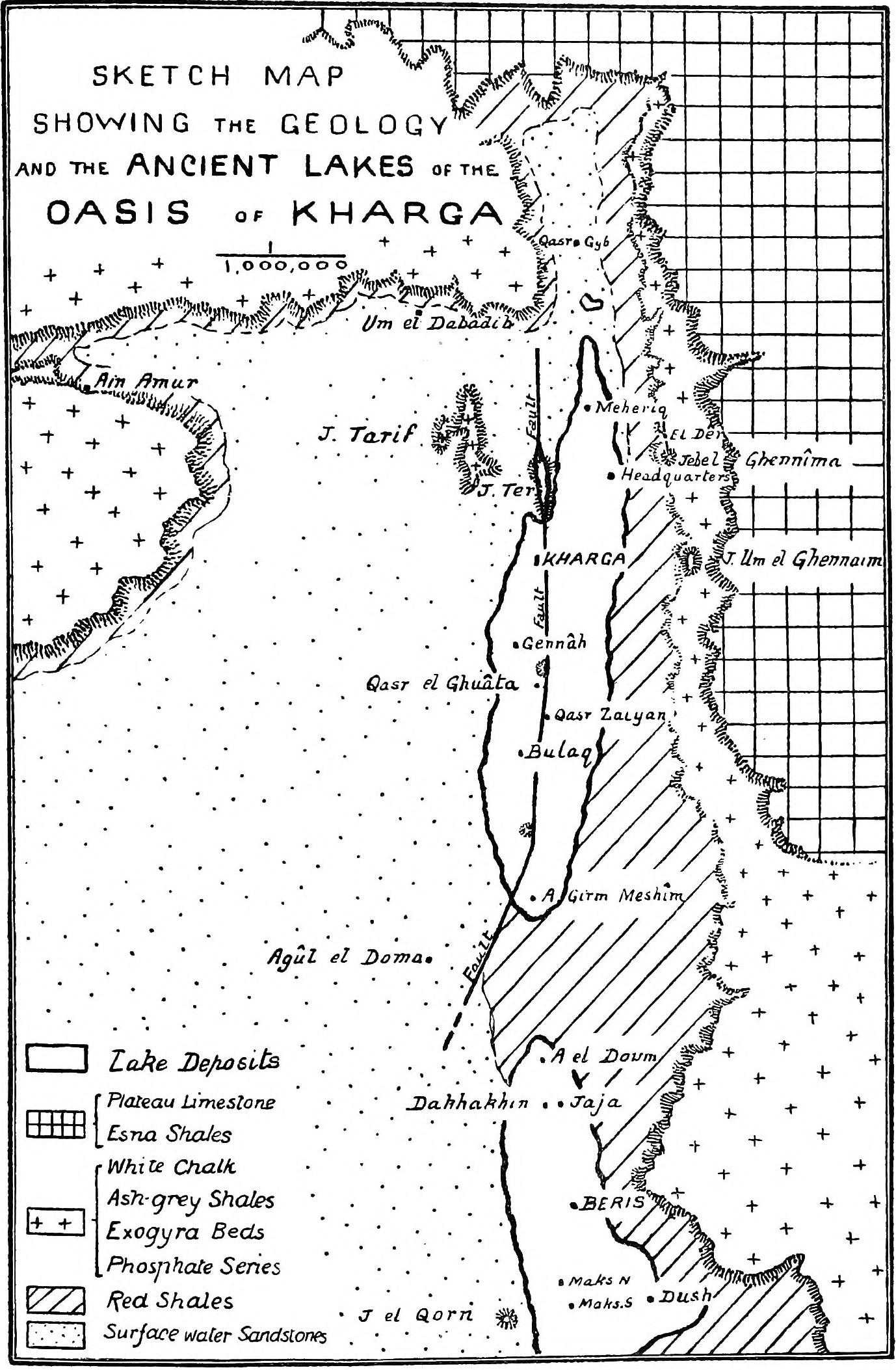 As a member of the Geological Survey of Egypt from 1896 to 1905, I spent nearly nine years in survey and exploration work in the Egyptian deserts, and for the past three years I have been in charge of extensive boring and land-reclamation[ix] operations in the particular oasis with which this book deals, so that I have had exceptional opportunities of studying at first hand a region of peculiar interest. Among other questions dealt with are the vast systems of subterranean aqueducts constructed by the Romans; the extensive lakes which occupied the floor of the oasis-depression well into historic times; the rate and mode of movement of desert sand-dunes; the formation and gradual elevation of the cultivated terraces by the constant accumulation of wind-borne material; and the deep-seated water-supplies, a subject which, in view of recent discussions as to the origin of the artesian waters of arid regions, is of more than local interest.