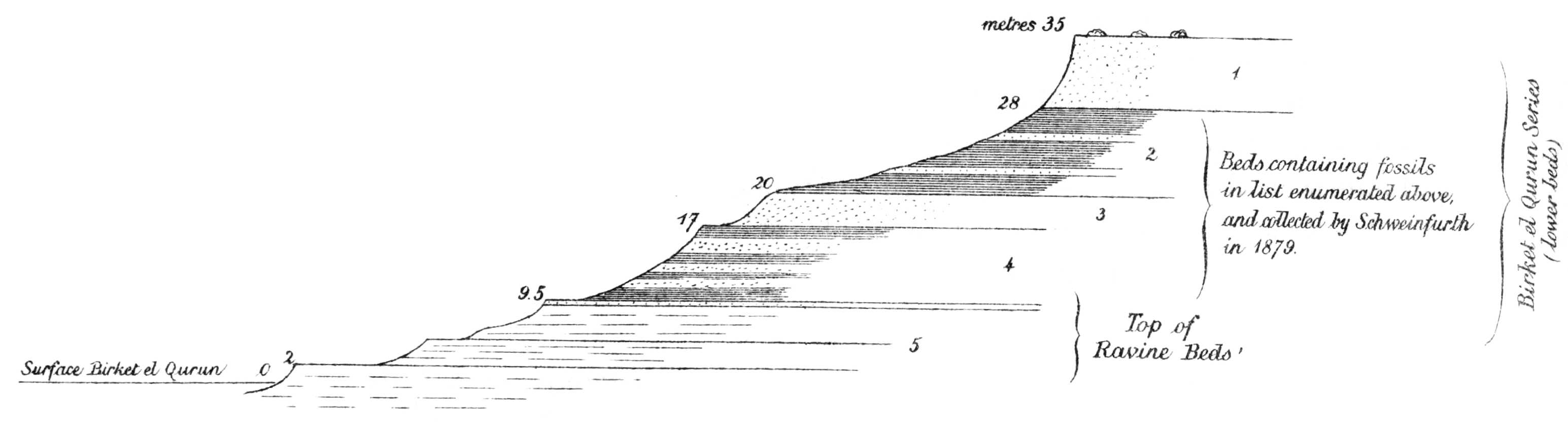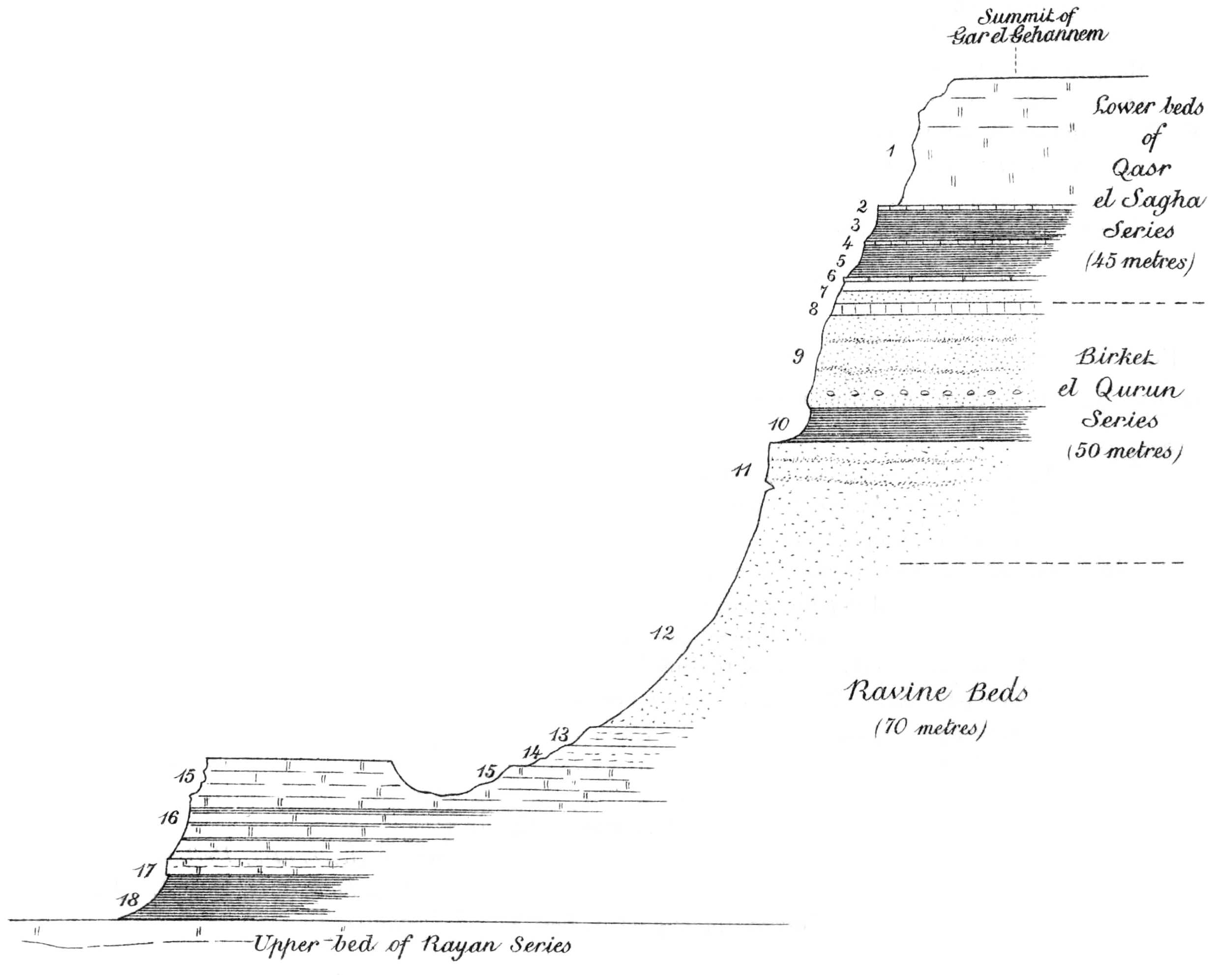 | C.—Birket el Qurun Series.—Homotaxial with quarried limestones of Cairo. Foraminiferal beds. Extension of series. Section at Ezba Qalamsha. Section north of Lahûn pyramid. East of Sersena and north-east of Rubiyat. Section 17 kilometres 28° N. of E. of Tamia. Series characterized by large globular concretions. Development and fauna in Geziret el Qorn. Zeuglodon remains. Profile at Geziret el Qorn. Rich molluscan fauna. Section on mainland opposite Geziret el Qorn. Section at west end of Birket el Qurûn. Formation of earth-pillars. Extension west of the lake. Development of the series in the Zeuglodon Valley. Abundance of skeletons of whales. Molluscan fauna. Pseudomorphs in celestine. Hill mass south of the Zeuglodon Valley. Junction of Birket el Qurûn series with overlying stage | 41 |