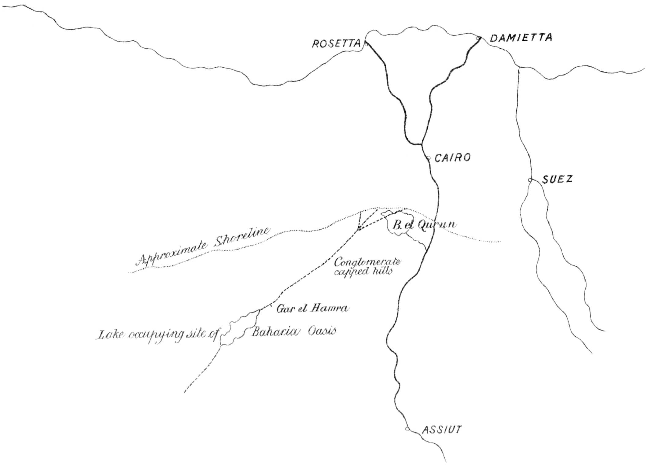 | Escarpments and plateaux. Extreme west and south-west limits of area. Ferruginous silicified puddingstone of ancient rivers. Jebel el Qatrani. Widan el Faras. Elwat Hialla. Garat el Gindi. Garat el Faras | 26 |