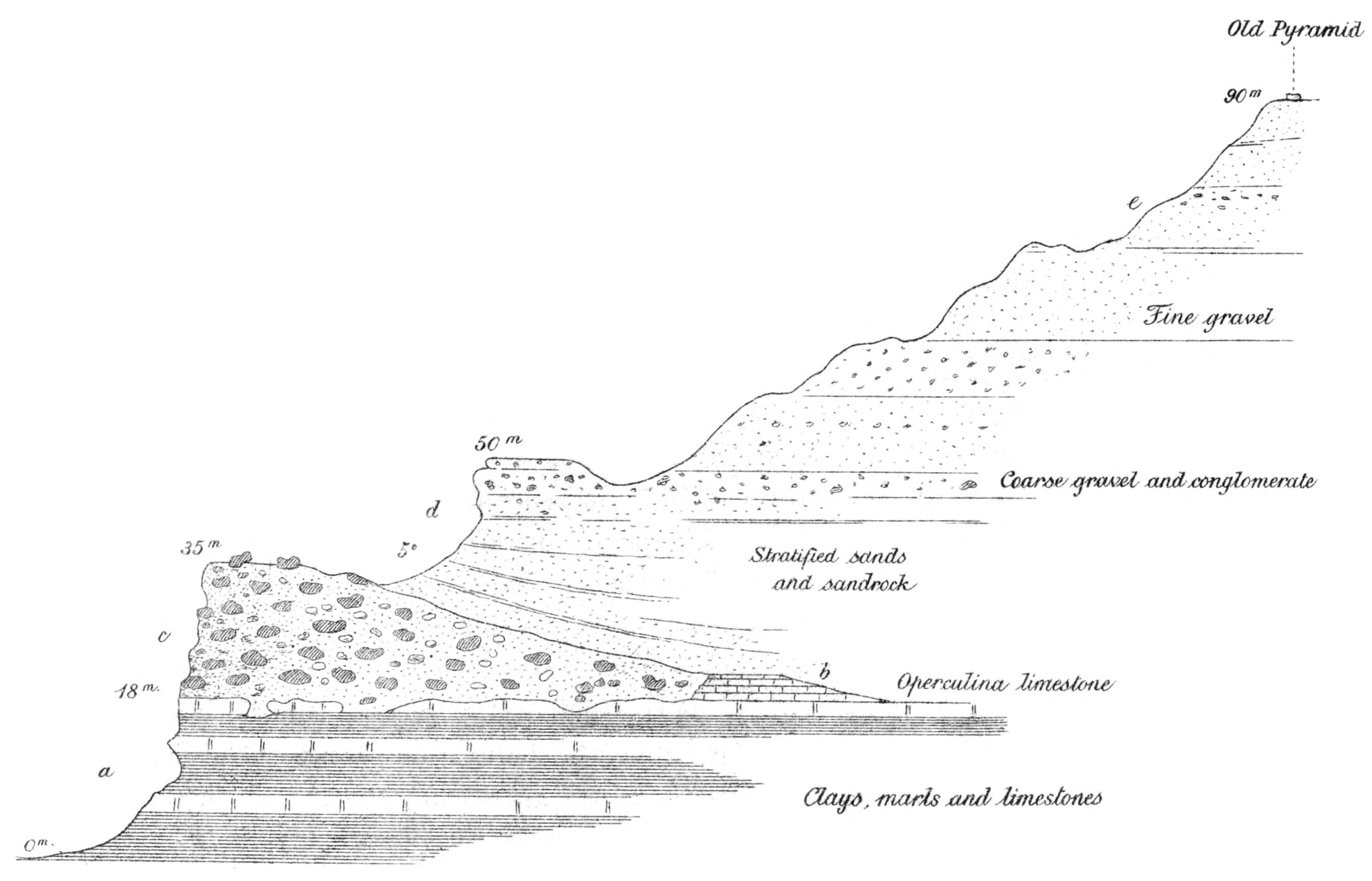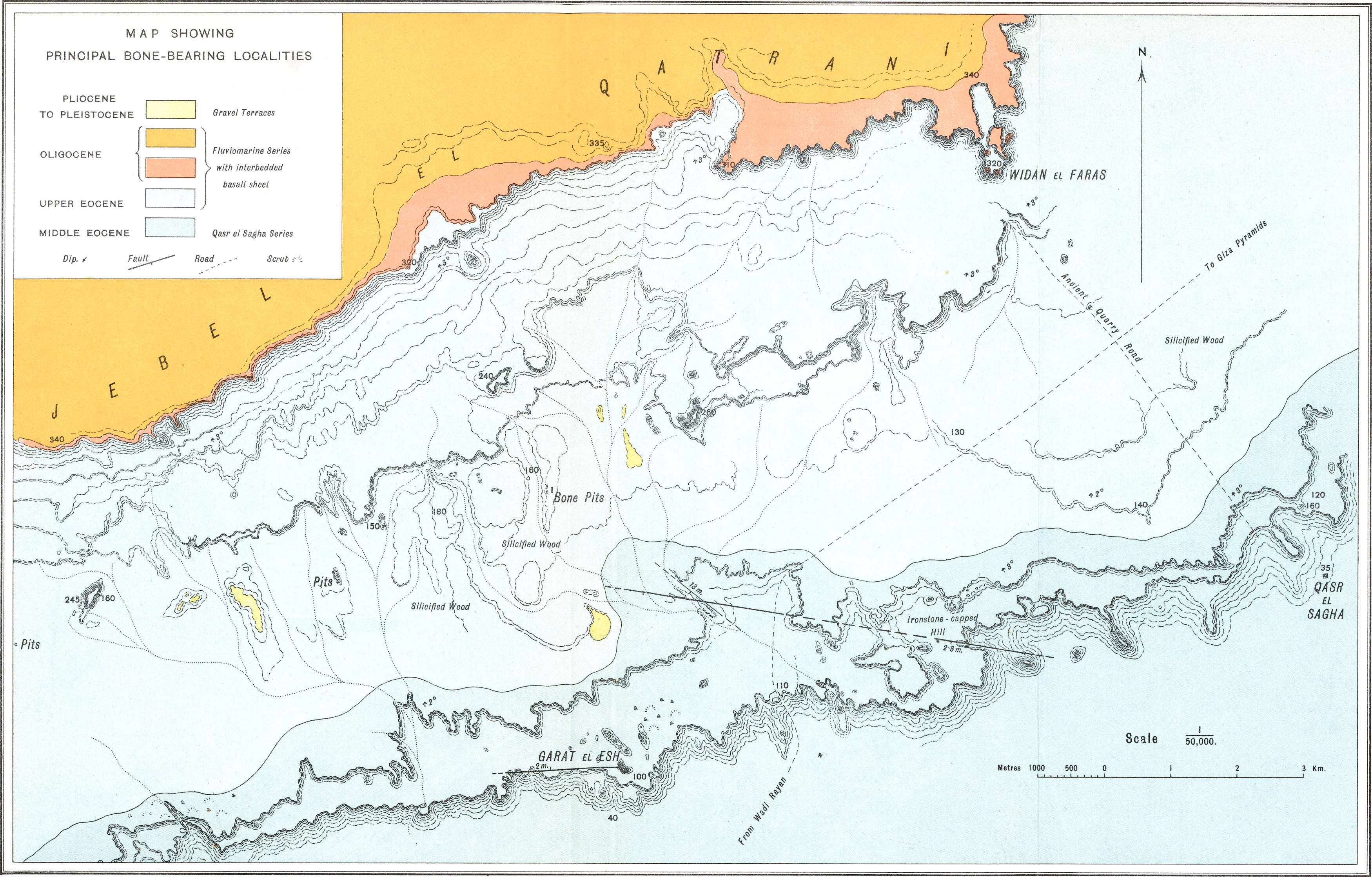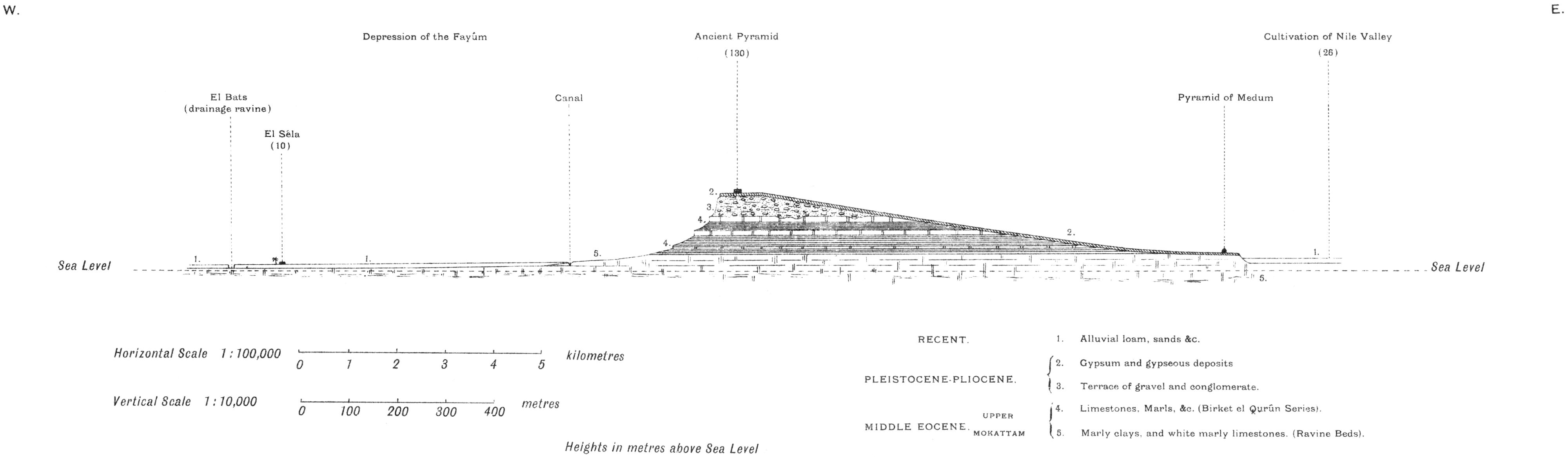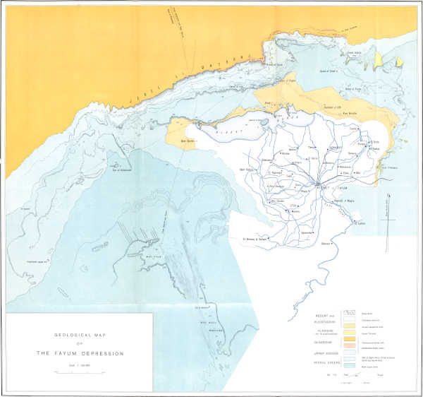 | Depression cut out in sedimentary rocks. Local lava flows. Dip. Oldest beds the Nummulites gizehensis limestones of Middle Eocene. Fluviomarine series of Upper Eocene and Oligocene age. Absence of Miocene strata. Pliocene, Pleistocene and Recent. Table showing succession and classification of strata | 33 |