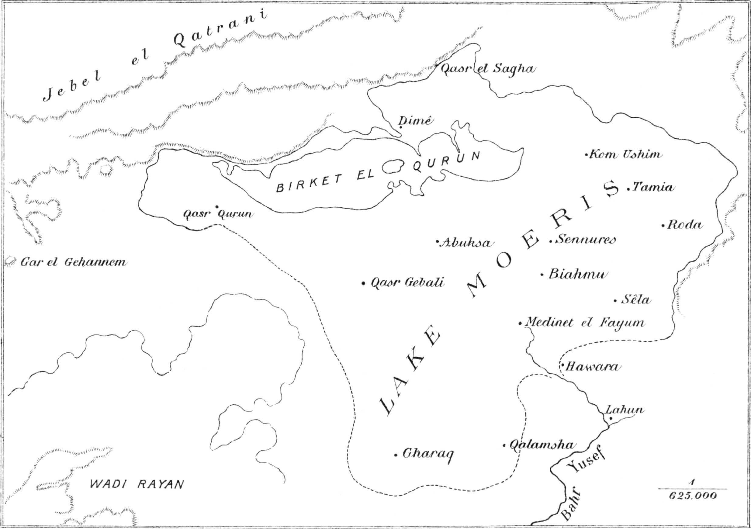 | Site, depth and dimensions. Remnant of Lake Moeris. Continual shrinkage of lake. Deposition of sand in lake at present day. Salinity of lake. Possible underground outlets. Currents | 12 |