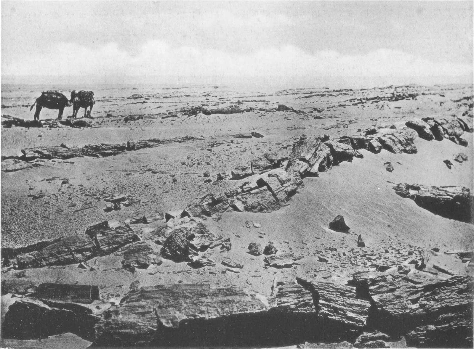 | E.—Fluvio-marine Series.—Nature of sediments, Interbedded basalts in upper part. Character of its invertebrate fauna. Conditions of deposition of series. Continuance of similar conditions to Miocene and even Pliocene times. Bone-beds at base of series. Association of skeletons of animals and forest trees. Preservation of remains. Analysis of fossil bones. Relation of Fluvio-marine series to underlying stage. Characteristics of the group. Its development in the field. Its slight development at Elwat Hialla. Section near Elwat Hialla. Constant northerly dip. Organic (molluscan) remains 9 and 14 kilometres north of Qasr el Sagha. Detailed section from near Qasr el Sagha to Widan el Faras. Determinations of mollusca from the series. Tripartite character of the series west of Widan el Faras and Qasr el Sagha. Occurrence of calcite, gypsum and chalcedony. Tabular chert and flint. Ancient workings. Extent of basalt. Silicified trees | 53 |