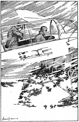 When the land beneath came into view, the oil prospector took his place in front of the port 255 section for his first view of the world from the clouds. Then day came and the east grew red. No settlement was yet in sight, but as the golden sun began to glisten on the snow-weighted trees, Colonel Howell gave an exclamation.