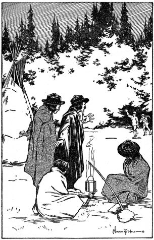 Roy, who was well pleased over so easily placating his chum, at once led the way around the race track and through the fringe of tepees, tents and other shelters being erected for the housing of the fast gathering arrivals. At last he stood before a group of mooseskin tepees in which were gathered several families of Cree Indians. These people had been brought from the present famous Indian encampment on the shores of Lac la Biche, just south of Athabasca River, where it turns on its long northward journey to the Arctic Ocean.