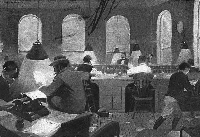 “Dick,” exclaimed the editor as he suddenly unclasped his hands, leaned forward over his desk again and shuffled the copy on it into a little bundle, “we’ll want about two and a half columns in the last edition.” As he spoke, a middle-aged man in his shirt sleeves—for the night was mid-June—leaned backward from a near-by big table at which a dozen men were busy cutting, rewriting and pasting copy, and took the little bundle of manuscript from his superior’s hands.