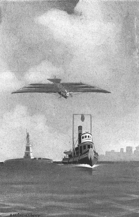 “Chambers,” said Mr. Latimer to the youngest of the trio, “get Governor’s island on the phone and see if they’ll put you on Colonel Fred Grant’s wire. If you can’t raise him by phone go down to the Ship News office and have the boys take you over in the boat. We want a good talk with him on this idea: What military prestige will it give the country that is the first to perfect an airship that can travel two hundred miles an hour—an aeroplane that can actually carry men and bombs? Point out that this means across the Atlantic in fifteen hours. Make him talk new stuff, practical, and cut out the Jules Verne patter.”