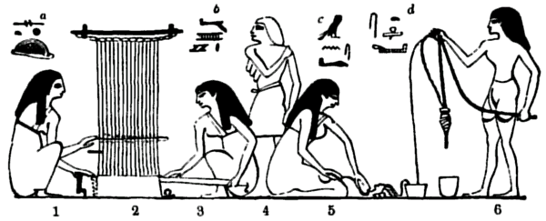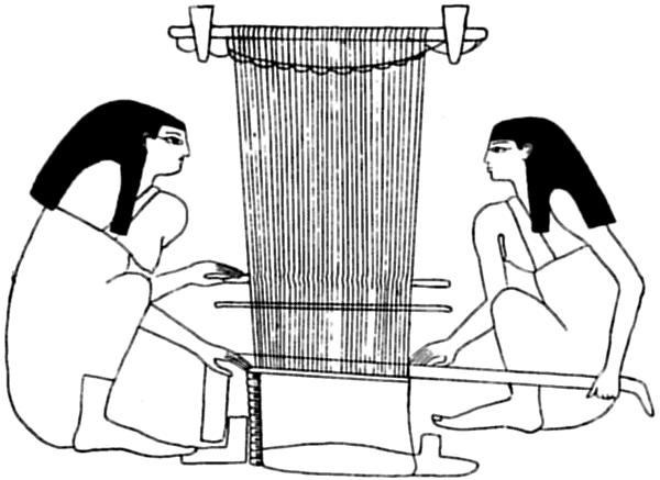 IN the tomb of Chnem-hotep, at Beni Hasan, there is a wall painting of a horizontal loom with two weavers, women, squatting on either side, and at the right in the background is drawn the figure of the taskmaster. There are also figures represented in the act of spinning, etc. For the present we are concerned with the weaving only.