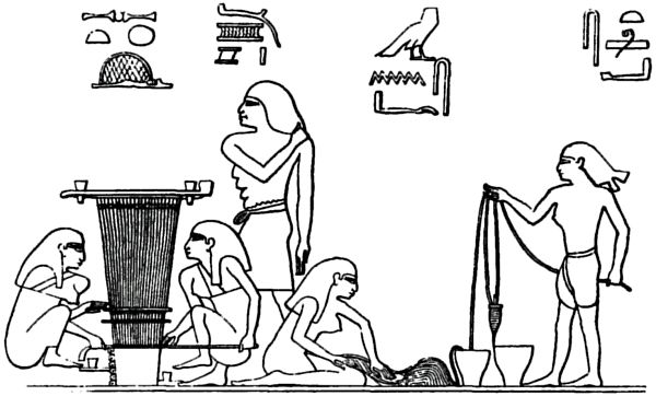 Since writing the above Mr. N. de G. Davies has very kindly sent me on a new set of illustrations, Fig. 16, of which he says; “My attention was called to the scene by Dr. Alan Gardiner. The scenes which represent the preparation of the flax and the stretching of the warp are almost replicas of those in the tomb of Daga of the Middle Kingdom, so far as we can judge, while the pictures of the looms resemble closely those in the tombs of Thot-nefer and Nefer-hotep. The work is done by both men and women. Men prepare the flax while women stretch the warp. Men mostly work the loom, either singly or with a companion. But in one case a woman is seen at work at one of the upright looms. She is shewn sitting sideways on the low bench and is not pictured in a back view with widely spread legs like the men. Unfortunately the work is so slovenly and so much injured that few exact outlines [Pg 18] can be secured, and hence all detail is insecure. There are also superfluous lines in red colour which confuse the picture. The tomb is Ramesside in date (circa 1200 B.C.) The inscription over the seated man is too broken to be read.”