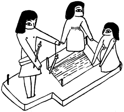 In consequence of this loom being represented as upright it is often spoken of as an upright or vertical loom. But it is drawn upright because the Egyptian artist did not understand perspective, and it was only by making the loom upright that he was enabled to show the details we have just been examining. For the same reason mat making is illustrated edgeways. If the loom were an upright one the two women weavers would have had their backs turned towards the [Pg 11] onlooker as can be seen in Fig. 9. Any doubt on the matter has however been set aside by Prof. John Garstang’s extremely interesting discovery of a wooden model depicting a group of women spinning and weaving which he illustrates in his work, The Burial Customs of Ancient Egypt, London, 1907. After referring to the woman spinning, he continues: “The other seated figures apparently represent women at work upon a horizontal loom; the frame and the woof [sic, should be warp] threads are faintly represented upon the board. It is possible that they are making mats or, perhaps, weaving (p. 132).” He gives an illustration of the group taken from a photograph, but as it does not show the lines which indicate the loom lying horizontally on the ground nor the warp threads, I have asked him to let me have a drawing made of it and, with his kind permission, it is now reproduced here, Fig. 10. The threads of the warp and the finished piece of cloth at the breast beam end are clearly indicated. The whole model supports conclusively the well founded supposition that the loom we have been considering is a horizontal one. Curiously enough, Prof. Garstang does not appear to appreciate the important bearing of his discovery, for on a later page (p. 134) in speaking of Lepsius’ illustration, discussed above, he says: “the weavers are seen at work at an upright loom.”
