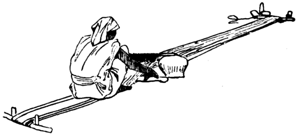 [Pg 19] Wooden pegs have been found at Gurob, which may possibly have been used for holding the warp and breast beams in position, Fig. 19. These pegs may appear to be rather short for the purpose, but in very primitive looms the warp is not kept so taut as might and should be, and hence there is not the same heavy strain on the pegs as we should deem necessary. The way to settle their use would be to fix them in solid ground and test them.