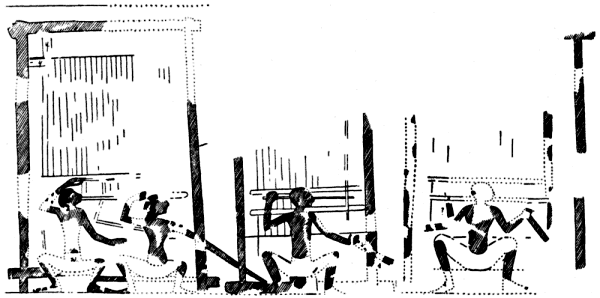 Fig. 16B.—Weavers at work as represented in the Tomb of Nefer-ronpet, Superintendent of Weavers at Thebes. Date about 1200 B.C. From a drawing by Mr. N. de G. Davies.
