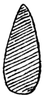 In 1875 several flat irregular oblong perforated pieces of soft chalk were found in enlarging the cattle market in Great Driffield, Yorkshire; they were found in a hole about three feet deep with Anglo-Saxon potsherds, animal remains, and bits of iron. They can now be seen in the Mortimer Collection in the Hull Museum. They consist of pieces of chalk, similar to those which drop annually in thousands upon thousands down the cliffs from the boulder clay between Bridlington and Flamborough. On some a shoulder has been cut, Fig. 34, most have one perforation, but in a few specimens, where the thin portion above the hole has been broken off, a second hole has been made. None of them can stand unsupported. Owing to the soluble nature of the chalk they could not have been used as net-sinkers in the sea (about nine miles off) for they would quickly dissolve in salt water, and the same holds good in regard to fresh water, although in a lesser degree. But I do not think they were used even in [Pg 38] fresh water as net-sinkers, for it was a characteristic of primitive peoples, with whom time was of no account, to do their work thoroughly—what they made was intended to last, and chalk net-sinkers would not have lasted. That these were found in a limited quantity, I believe about seventeen in number, tends to show that they are warp weights, for only a few are required for every loom, in spite of the considerable number shown in the non-technical illustration of Penelope’s loom. Not being able to find any other use for these pieces of chalk, and judging that they are suitable for the purpose, I should say they are warp weights. In this case the weaver has made the most of what nature has given him; in other parts of England he has had to fashion the weight out of the rough chalk, Fig. 35.