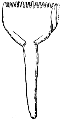 Fig. 22.—Weaver’s Comb—a Beater-in. 19·5 cm. × 9·8 × 4·2 (7¾ in. × 37/8 in. × 15/8 in.) Gurob. Manchester Museum.