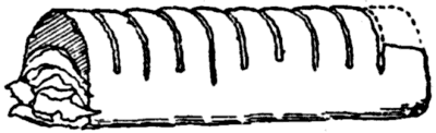 Fig. 35.—“Chalk weight, 6" × 4" × 2" (15·2 cm. × 10·2 × 5·1), similar to those found in pits, at Mount Caburn and Cissbury near Worthing, Sussex. Found with eighteen more in the filling of pit 7, Winkelbury Hill.” Excavations in Winkelbury Camp, by Lieut.-Gen. Pitt-Rivers (Excavations in Cranbourne Chase, Vol. II., 1888). As Pitt-Rivers also found at Winkelbury the fragment of a comb and a chalk spindle whorl, which are textile tools, we may safely presume these fashioned pieces of chalk are warp weights.