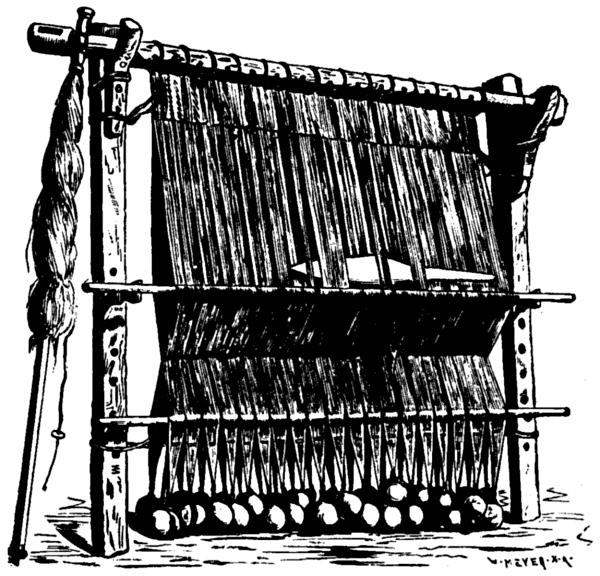 In the above classical illustrations which are after all only rough diagrams, the warp weights appear to hang from a single thread only, but this can not have been correct. The warp threads must have been bunched, because a single suspended thread with a tension weight immediately begins to unravel, and so loses the advantage of its having been spun, as any one can ascertain for oneself. As regards the same point on the Lake Dwellers looms, Cohausen was the first to surmise that the warp threads were bunched to receive the weight, and Messikommer proved it by practical experiment.[G]