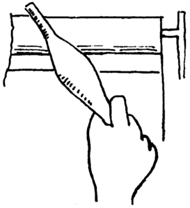 Fig. 38.—Hand of Penelope clutching her shuttle. From a corner of a piece of sculpture discovered by O. Kern and described by C. Robert, (The Feet Washing of Odysseus, fifth Century B.C., Mitt. Kais. Deutsch. Arch. Inst., Athens, XXV., 1900, pp. 332-3). The author considers Penelope to be in the act of unravelling what she has woven: “We see her holding the spool with her right hand, while the left hand, half closed, is raised to about shoulder high, and the fingers, if I read the traces correctly, are posed as though she held a thread.”