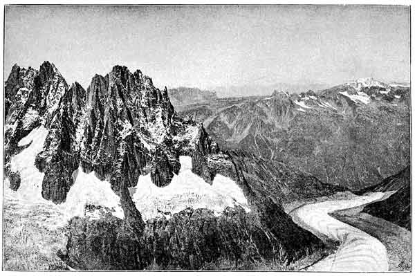 "Here may the eye, as it sweeps along the horizon, embrace a line of snowclad mountains such as exist in no other part of the world, stretching over one third of the entire circle, at a distance of forty or fifty miles, their peaks towering over a sea of intervening ranges piled one behind another, whose extent on either hand is lost in the remote distance, and of which the nearest rises from a gulf far down beneath the spectator's feet, where may be seen the silver line that marks a river's course, or crimson fields of amaranth and the dwellings of man. Sole representative of animal life, some great eagle floats high overhead in the pure dark-blue sky, or, unused to man, fearlessly sweeps down within a few yards to gaze at the stranger who intrudes among these solitudes of Nature. As the sun sinks, the cold grey shadow of the summit where we stand is thrown forward, slowly stealing over the distant hills, and veiling their glowing purples as it goes, carries the night up to the feet of the great snowy peaks, which still rise radiant in the rosy light above the now darkening world. From east to west in succession the splendour fades away from one point after another, and the vast shadow of the earth is rapidly drawn across the whole vault of heaven. One more departing day is added to the countless series which 12 has silently witnessed the deathlike change that passes over the eternal snows, as they are left raising their cold pale fronts against the now leaden sky; till slowly with the deepening night the world of mountains rises again, as it were, to a new life, under the changed light of the thousand stars which stud the firmament and shine with a brilliancy unknown except in the clear rarefied air of these sublime heights."