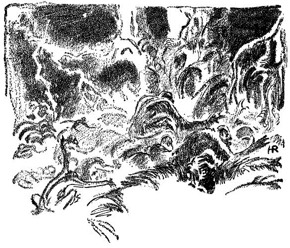 When, two days after my frightful crawl through that crypt of the eyes and claw, I learned that a thing had malignly hovered twenty miles away at the same instant the eyes were glaring at me, I experienced virtual convulsions of fright. But that fright was so mixed with wonder and alluring grotesqueness that it was almost a pleasant sensation. Sometimes, in the throes of a nightmare when unseen powers whirl one over the roofs of strange dead cities toward the grinning chasm of Nis, it is a relief and even a delight to shriek wildly and throw oneself voluntarily along with the hideous vortex of dream-doom down into whatever bottomless gulf may yawn. And so it was with the waking nightmare of Tempest Mountain; the discovery that two monsters had haunted the spot gave me ultimately a mad craving to plunge into the very earth of the accursed region, and with bare hands dig out the death that leered from every inch of the poisonous soil.