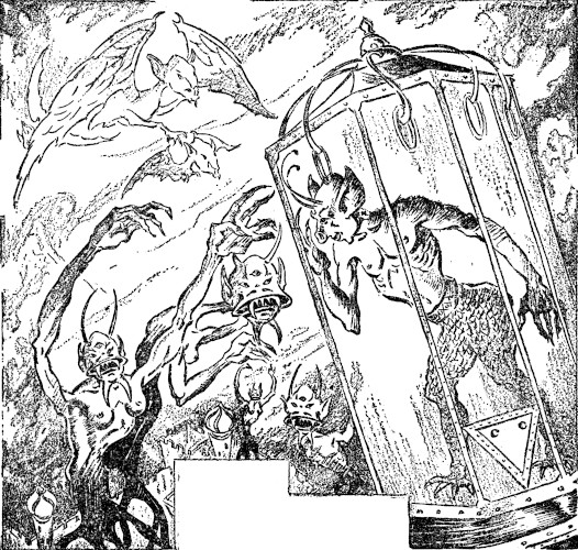 Slowly Carter's plans went forward. He provided a light-wave envelope of abnormal toughness, able to stand both the prodigious time-transition and the unexampled flight through space. He tested all his calculations, and sent forth his Earthward dreams again and again, bringing them as close as possible to 1928. He practised suspended animation with marvelous success. He discovered just the bacterial agent he needed, and worked out the varying gravity-stress to which he must become used. He artfully fashioned a waxen mask and loose costume enabling him to pass among men as a human being of a sort, and devised a doubly potent spell with which to hold back the Dholes at the moment of his starting from the dead, black Yaddith of the inconceivable future. He took care, too, to assemble a large supply of the drugs—unobtainable on Earth—which would keep his Zkauba-facet in abeyance till he might shed the Yaddith body, nor did he neglect a small store of gold for earthly use.