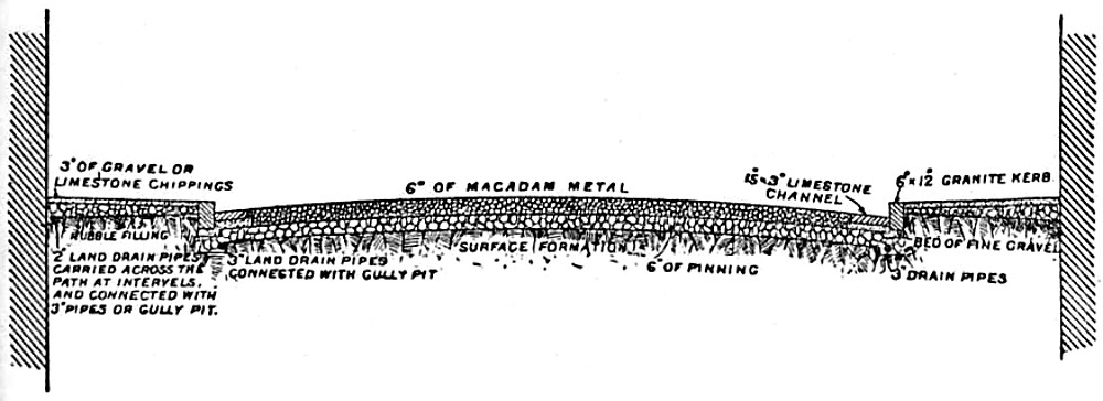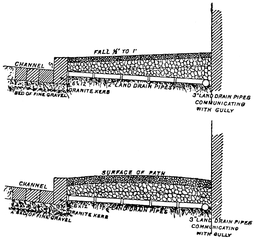 Foundation — List of materials for footpaths — Mastic asphalte — Description of manner of laying — Proportions of asphalte, bitumen, and grit — Yorkshire flagging — Specification for York flagging — Caithness flagging — Its advantages — Blue lias flagging — Concrete footpaths — Description of American concrete path — Artificial stone pavements — Brick footpaths — Granite slabs — Artificial asphalte paths — Specification of tar pavement — American tar pavement — Gravel footpaths — Sections of paths — Tarred paths106
