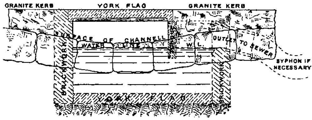 Necessity for kerb — Section of granite kerb and channel — Setting kerb — Cost of kerb and channelling — Necessity for gutter or channel crossings — Gully gratings — Objects to be attained — Drawing of a gully-pit — Drawing of a buddle-hole — Mr. Baldwin Latham on the subject123