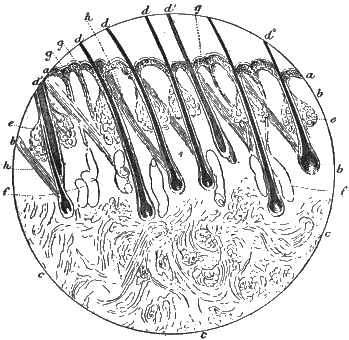 Before speaking of actual processes of manufacture, it is necessary to devote some attention to the structure and chemical constitution of hide or skin, which forms the raw material. Although a great variety of skins are employed in tanning, they are all constituted on the same general type, and an anatomical description of the hide of the ox will apply almost equally to those of the calf, sheep, and goat; but from differences in thickness and closeness of texture, their practical uses differ widely. Fig. 1 shows a section of ox-hide, cut parallel with the hair, magnified about 50 diam.: a, epithelial layer or epidermis, consisting of horny layer above, and rete malpighi below; b, pars papillaris, and c, pars reticularis of corium, derma, or true skin; d, hairs; e, sebaceous or fat-glands; f, sudoriferous or sweat-glands; g, opening of ducts of sweat-glands; h, erectores pili muscles, for erecting the hair.