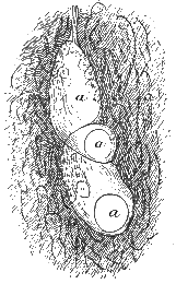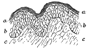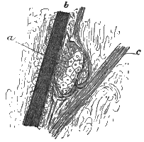 Outside the inner root-sheath is a layer of nucleated cells, continuous with those of the epidermis, and of the same « 6 » character. This is the "outer root-sheath," and is shown at d, Fig. 4. This, together with the whole of the epidermis, is covered next the corium with an exceedingly fine membrane, called the "hyaline" or glassy layer. It is possible that this forms the very thin buff-coloured "grain" of tanned leather, which evidently is of different structure from the rest of the corium, since, if it gets scraped off before tanning, the exposed portion of the pars papillaris remains nearly white, instead of colouring. The whole of the hair-sheath is enclosed in a coating of elastic and connective-tissue fibres, which are supplied with nerves and blood-vessels, and form part of the corium. Near the opening of the hair-sheaths to the surface of the skin, the ducts of the sebaceous or fat-glands (e, Fig. 1), pass into them, and secrete a sort of oil to lubricate the hair. The glands themselves are formed of large nucleated cells, arranged somewhat like a bunch of grapes; one is shown highly magnified in Fig. 5: a, sebaceous gland; b, hair-stem; c, part of erector pili muscle. The upper and more central cells are most highly charged with fat, which is shown by the darker shading.