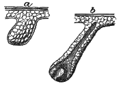 The fresh hide consists of 2 layers: an outer, the epidermis; and an inner, the true skin. The epidermis is very thin as compared with the true skin which it covers, and is entirely removed preparatory to tanning; it nevertheless possesses important functions. It is shown in Fig. 1 at a, and more highly magnified in Fig. 2. Its inner mucous layer b, the rete malpighi, which rests upon the true skin c, is soft, and composed of living nucleated cells, which are elongated in the deeper layers, and gradually become flattened as they approach the surface, where they dry up, and form the horny layer a. This last is being constantly worn away, and thrown off as dead scales of skin; and as constantly renewed from below, by the continued multiplication of the cells. It is from « 3 » this epithelial layer that the hair, as well as the sweat- and fat-glands, are developed. It will be seen in Fig. 1 that each hair is surrounded by a sheath, which is continuous with the epidermis. In embryonic development, a small knob of cells forms on the under side of the epidermis, and this enlarges, and sinks deeper into the true skin, while the root of the young hair is formed within it; this is shown in Fig. 3, a b. Smaller projections also form on the stalk of the knob, and in due time produce the sebaceous glands. The process of development of the sudoriferous glands is very similar to that of the hairs. There is a great analogy between this process and that of the ordinary renewal of hair in the adult animal. « 4 » At d1 Fig. 1, is seen an old and worn-out hair. It is shrunken and elongated, and is almost ready to fall out. It will be noticed that its sheath or follicle projects somewhat below the hair to the right. This is the first production of a young hair, and is quite analogous to the knob of epithelium which has been described as forming the starting-point of a hair in embryo. At d2, the same process is seen further advanced, the young hair being already formed, and growing up into the old sheath. At d3, it is complete, the old hair having fallen out, and the young one having taken its place.