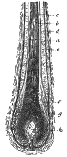 The fibrous part of the hair is made up of long spindle-shaped cells, and contains the pigment which gives the hair its colour. The hair of the deer differs from that of most other animals in being almost wholly formed of polygonal cells, which, in white hairs, are usually filled with air. At its « 5 » base, the hair swells into a bulb, which is hollow, and rests on a sort of projecting knob of the corium, called the hair-papilla. This has blood-vessels and nerves, and supplies nourishment to the hair. The hair-bulb is composed of round, soft cells, which multiply rapidly; as they grow, they press upward through the hair-sheath, become elongated and hardened, and form the hair. In dark hairs, both the cells of the hair itself and those of its follicle or sheath are strongly pigmented, but the hair much the more so, and hence the bulb has usually a distinct dark form. The dark-haired portions of a hide from which the hair has been removed by liming still remain coloured, from the pigmented cells of the hair-sheaths, which can only be got out completely by bating and scudding. The cells outside the bulb, shown at f, in Fig. 4, pass upwards as they grow, and form a distinct coating around the hair, which is called the "inner root-sheath." This again consists of 2 separate layers, of which the inner is "Huxley's," the outer, "Henle's." They arise from the same cells in the base of the hair; but in the inner layer, these remain polygonal and nucleated, while in the outer, they become spindle-shaped and without nuclei. The inner root-sheath does not extend to the surface of the skin, but dies away below the sebaceous glands. This figure represents an ox-hair root, mag. 200 diam.: a, fibrous substance of hair; b, hair cuticle; c, inner root-sheath; d, outer root-sheath; e, dermic coat of hair-sheath; f, origin of inner sheath; g, bulb; h, papilla.