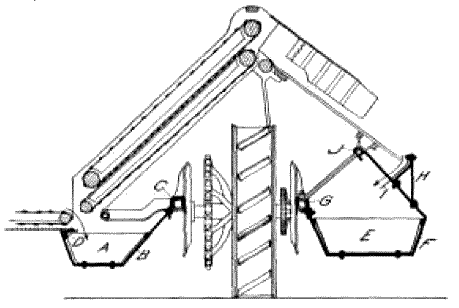 Fig. 5.—Rear view of a grain binder, showing a cross section of the pans and supports and the parts of the machine to which they are attached. A, Pan under the opening between the platform and lower elevator; B, support of the pan; C, stirrup which fits over the inside sill and to which the support is bolted; D, angle iron under the end of the platform and over which one end of the support is hooked; E, cross section of pan under the binder deck; F, support of the pan; G, stirrup which hooks over the outside sill and to which the support is bolted; H, angle iron which supports the guard at the end of the deck; I, guard which directs the seed that falls on the binder deck into the pan below; J, binder pipe over which one end of the support is hooked.