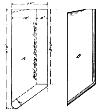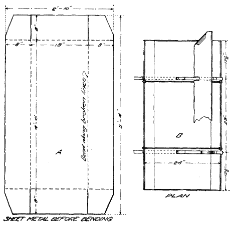 Fig. 6.—Plans for the pan to be placed under the binder deck of the grain binder. A, Size and shape the metal should be cut before bending; B, general plan of the pan when completed, as viewed from the top.