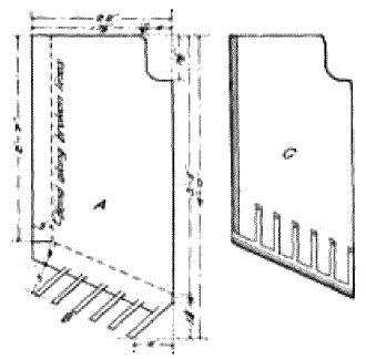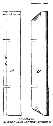 Fig. 9.—Extension to the binder deck of the grain binder. A, size and shape of the metal before bending; B, extended points which are to be bolted to the main portion of the metal; C, extension when completed.