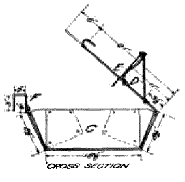 The pan to be placed under the deck of the machine will serve to collect the seed which is shattered on the deck and the extension to the deck. The plans for making this pan are shown in detail in figure 6. The material should be cut along the solid lines and of the size designated in figure 6, A. The sides of the pan should be bent upward on the dotted lines, so that the pan will be 24 inches wide at the top. The ends should then be made in the manner described for the pan which is placed under the opening of the platform and lower elevator. A door may be put in the rear end of this pan if desired; but this is not necessary, as no trouble will be experienced in removing the seed. Figure 6, B, gives a top view of the pan when completed and also a portion, of the guard which serves to direct into this pan the seed which shatters on the deck. This guard is shown in detail in figure 7. As this pan is larger and heavier than that placed under the lower elevator, not only should it have strips of iron riveted to the outer edges of the sides, but two cross braces also should be employed. Those may be fastened to the strips of iron supporting the sides of the pan and should be about 12 inches from the ends of it. This pan is supported by two strips of strap iron bent to conform « 12 » to the outside of a cross section of it and hook over the binder pipe under the deck and bolt to stirrups placed on the outer sill of the frame. Each support may be made from one strip of strap iron. It may be necessary to bend the ends of the supports which hook over the binder pipe in opposite directions. Both ends of the supports which hook over the binder pipe may hook outward, as shown in figure 7, C, or the rear support may hook inward, as illustrated in figure 5. It is not absolutely necessary that those supports of the pan hook in opposite directions on the binder pipe, yet when this is done it will make the pan more rigid. The pan may be attached by first hooking the supports over the binder pipe underneath the deck and then bolting the other end of the supports to the stirrups on the outer sill. The pan should be fastened to the supports. A cross section of this pan, the supports for it, and the stirrups which hook over the sill are shown in figure 7, C.