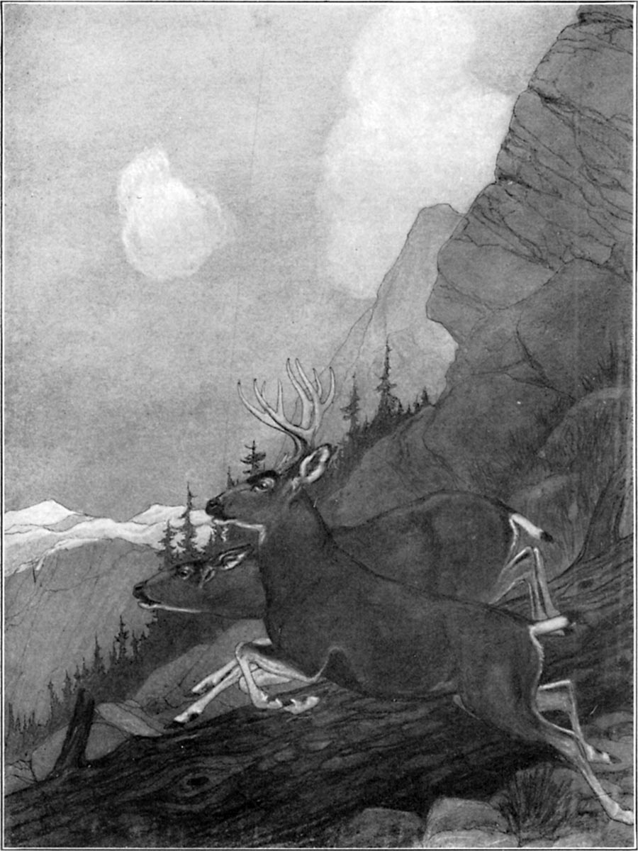 One day when the pups were a month old and had recently been out for their first romp Breed hunted across the divide and down the western slope of the Kootenais. He stood on a ridge in the gathering dusk when he was suddenly aware that other hunters were abroad before him. His eye caught flashes of white through the green of the spruce on the opposite slope. He knew that a band of deer had been startled to sudden flight, that the jerky gleams of white were the brief exposures of the underparts of their tails as they were upflung in hurdling windfalls. The wind was wrong and Breed could not catch the190 scent. He traced their course through the timber by their white flags and saw three deer break cover and start out across a long narrow opening on the slope, the path of a snowslide that had stripped a lane through the trees on the steep side hill, its trail a clean split in the solid green of the spruce. In the center of the slide the lead deer suddenly collapsed and the sharp report of a rifle rolled across the hills.